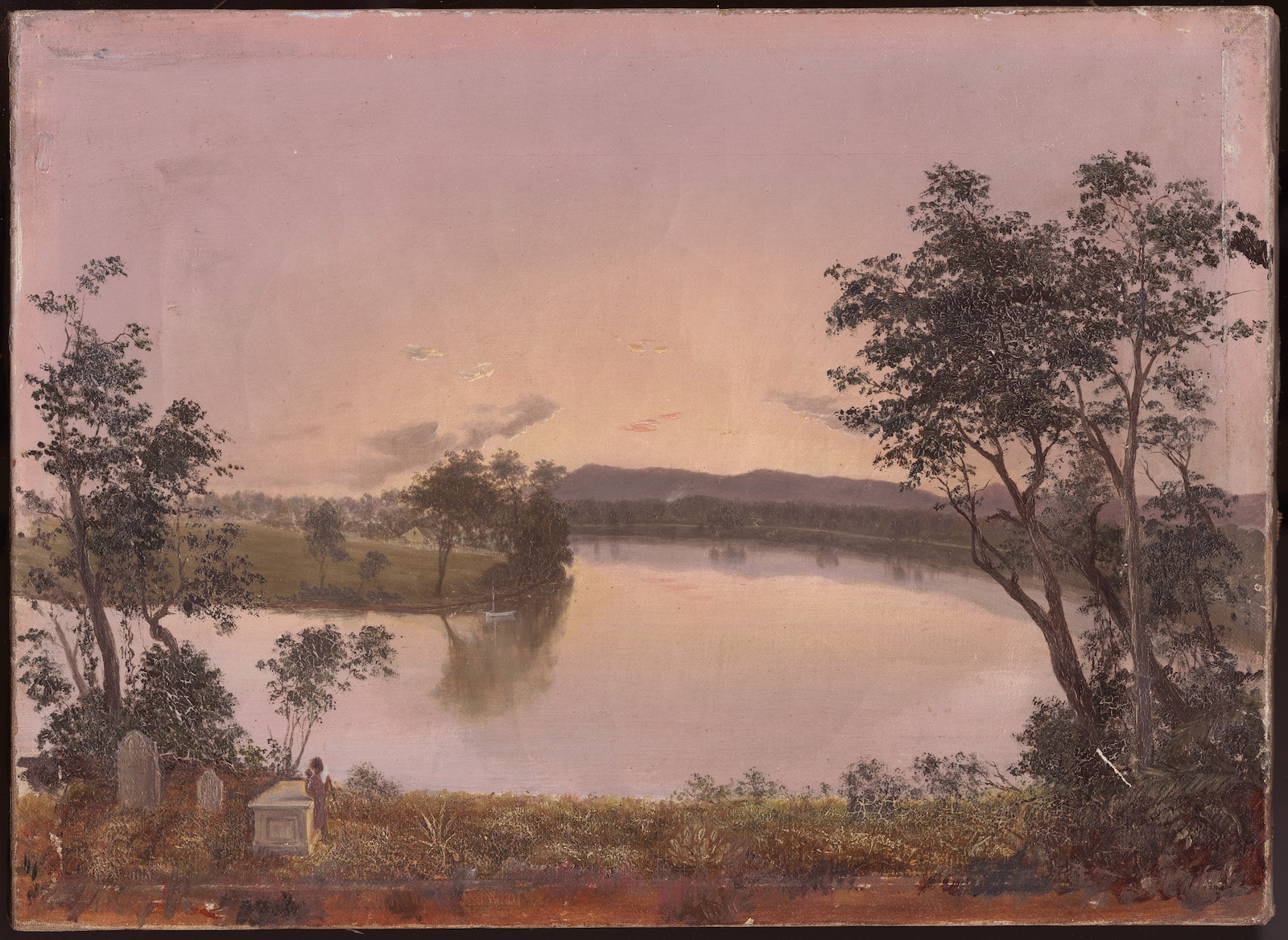 H. F. Smith Work of Art Painting by H. F. Smith depicting the graves of soldiers' children at North Quay, with the Brisbane River in the middle and far distance — State Library of Queensland.